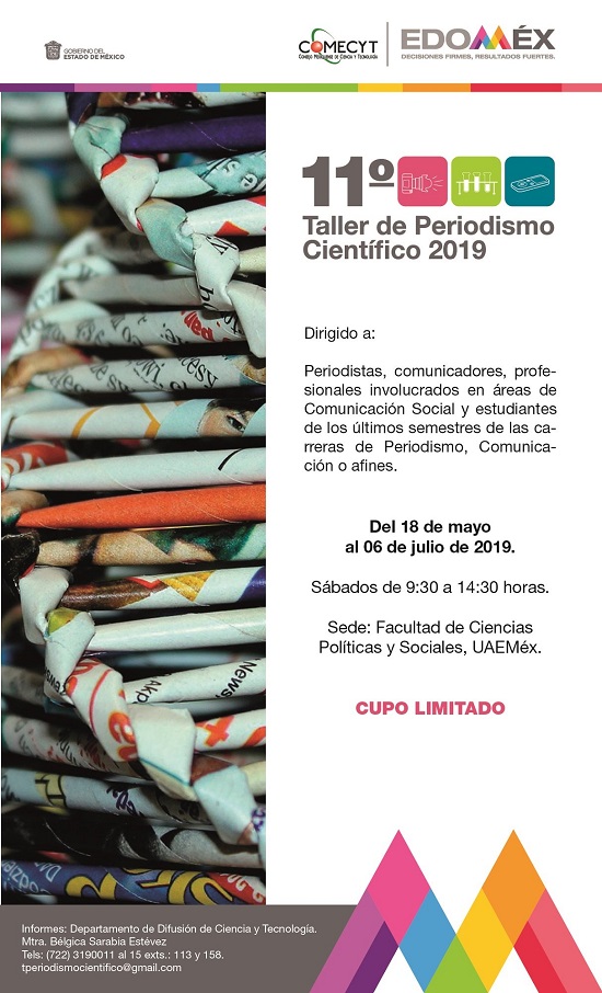 Con el objetivo de mejorar las competencias y habilidades de las personas que comunican, difunden y divulgan los hechos científicos y tecnológicos, el Consejo Mexiquense de Ciencia y Tecnología (Comecyt) invita a participar en la decimoprimera edición del Taller de Periodismo Científico.