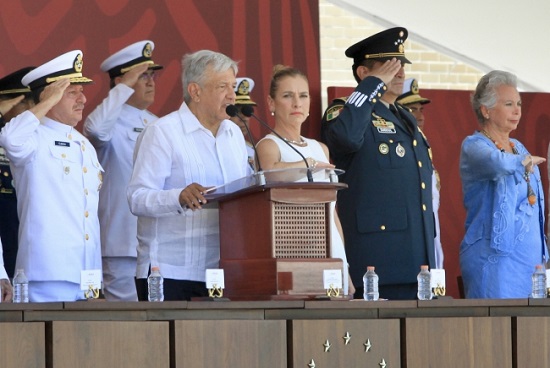 Previamente, López Obrador tomó protesta a 202 cadetes del primer año de la Escuela Naval Militar, quienes juraron lealtad incondicional a la bandera, además les hizo entrega del espadín, símbolo de liderazgo.