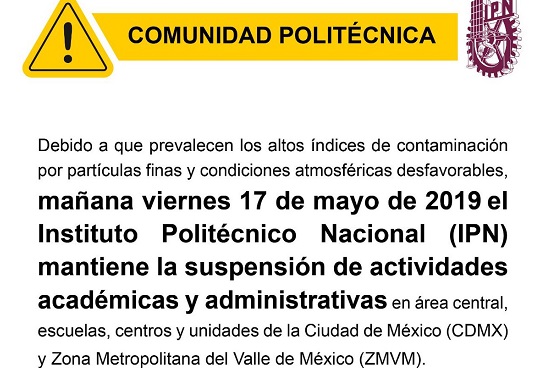 El Instituto Politécnico Nacional (IPN) continuará con la suspensión de clases y actividades administrativas mañana viernes 17 de mayo en escuelas, centro y unidades de la Ciudad de México y la zona metropolitana del Valle de México.