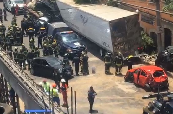 Según testigos, policías perseguían al chofer del tráiler y éste perdió el control del tractocamión, se estrelló contra al menos cinco vehículos, atropelló a varias personas, dejando sin vida a tres de ellas y heridas a 12 más, y paró su carrera contra unidad de carga.