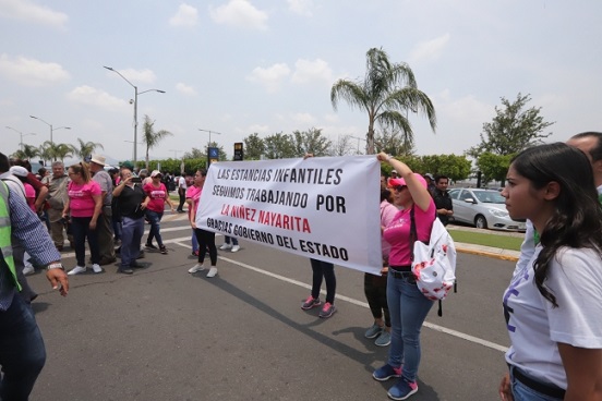 Con gritos de “no somos una, no somos 100, somos estancias, cuéntanos bien”, las trabajadoras mostraron una manta en la que se leía: “Las estancias infantiles seguimos trabajando por la niñez nayarita. Gracias gobierno del estado”.