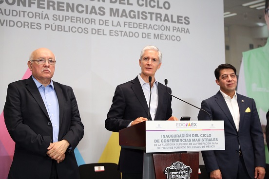 Con la finalidad de fortalecer la transparencia, mejorar el desempeño de los servidores públicos e impulsar la profesionalización en materia de ejercicio y control del gasto, el Gobernador Alfredo Del Mazo Maza y el Auditor Superior de la Federación, David Colmenares Páramo, inauguraron el Ciclo de Conferencias Magistrales de la Auditoría Superior de la Federación para Servidores Públicos del estado.