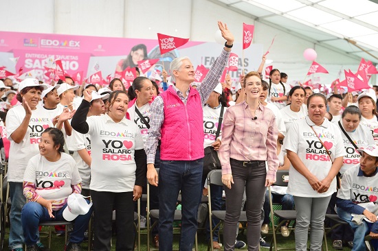 En esta gira de trabajo, Del Mazo Maza reiteró que el programa del Salario rosa fue creado para reconocer el trabajo que realizan las amas de casa para que sus familias estén unidas, al estar al pendiente de sus hijos, esposos y padres los siete días de la semana, las 24 horas del día.