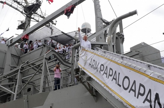 A bordo del buque “Papalopan” de la Armada de México, el jefe del Ejecutivo y el secretario de Marina-Armada de México (Semar), almirante José Rafael Ojeda Durán, escucharon la “Evocación a los Marinos” y depositaron una ofrenda floral.