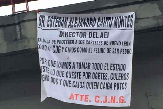 Al menos 11 mantas del crimen organizado firmadas por el Cartel Jalisco Nueva Generación (CJNG) con amenazas en contra del director de la Agencia Estatal de Investigaciones (AEI) han sido exhibidas durante este martes en diversos sitios de la zona metropolitana de Monterrey, principalmente en la capital regia, San Nicolás de los Garza y San Pedro.