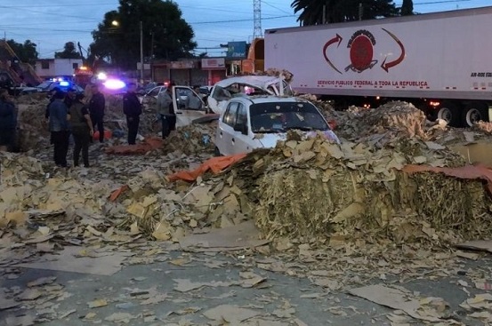 Además, resultaron dañados un taxi y un auto particular, mientras que servicios de emergencia laboran para retirar las pacas de cartón de casi una tonelada cada una, mientras que personal del Ministerio Público y de la Fiscalía mexiquenses trabajan para levantar el cuerpo de la mujer, luego que el chofer ya fue detenido.