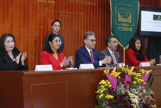 Durante el cuarto informe anual de actividades de la directora de la Facultad de Economía, Reyna Vergara González, Barrera Baca recordó que en septiembre de 2018, la UAEM fue sede del Foro de Consulta Estatal Participativa por un Acuerdo Nacional sobre la Educación y este viernes 14 de junio, su campus Ecatepec será anfitrión del Foro Regional de Ciencia, Tecnología e Innovación sobre el Plan Nacional de Desarrollo.