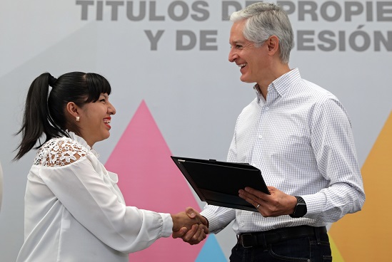 Alfredo Del Mazo Maza puntualizó que en 2017 se entregaron 5 mil títulos de posesión, en 2018 se otorgaron 16 mil y la meta para este año es apoyar a más de 32 mil familias.