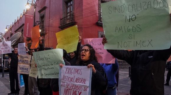 Previo a la conferencia matutina, un grupo de extrabajadores de la Agencia de Noticias del Estado Mexicano (Notimex) se manifestaban bajo el argumento de que la directora los despidió de manera injusta, por lo que pedían ser reinstalados en sus lugares de trabajo.