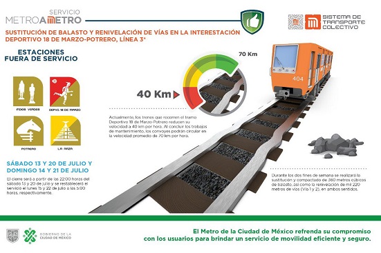 “Con la finalidad de conservar los niveles de seguridad en Línea 3 se suspenderá el servicio en el tramo de Indios Verdes a La Raza, durante dos fines de semana, para realizar trabajos de sustitución de balasto y renivelación de vías”, detalló el organismo en su cuenta en Twitter @MetroCDMX.