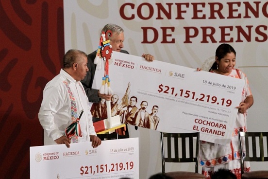 Los alcaldes de Metlatónoc y Cochoapa El Grande, dos de los municipios más pobres de Guerrero y del país, recibieron hoy en Palacio Nacional 21 millones de pesos cada uno, producto de la subasta de terrenos y residencias decomisadas a la delincuencia organizada.