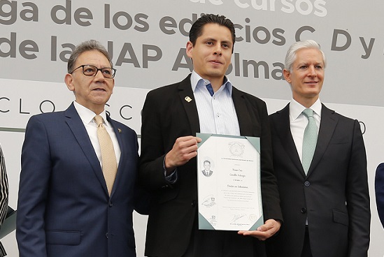 En el marco de la inauguración del ciclo escolar 2019-2020 de la Universidad Autónoma del Estado de México, que se llevó a cabo en la Unidad Académica Profesional UAEM Acolman, el gobernador Alfredo Del Mazo Maza y el rector de esta casa de estudios, Alfredo Barrera Baca, realizaron la entrega simbólica de nuevos títulos profesionales a tres egresados de las facultades de Planeación Urbana y Regional, Arquitectura y Diseño y Odontología.