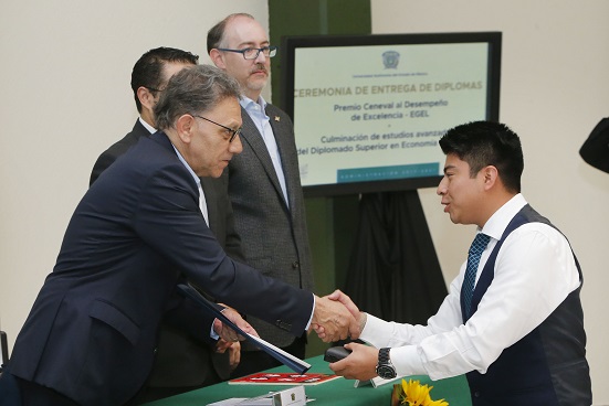 El rector de la Universidad Autónoma del Estado de México, Alfredo Barrera Baca, entregó el Premio CENEVAL al Desempeño de Excelencia EGEL a tres egresados del Centro Universitario UAEM Valle de México, así como reconocimientos a 25 estudiantes de este campus que culminaron el Diplomado Superior en Economía Financiera.