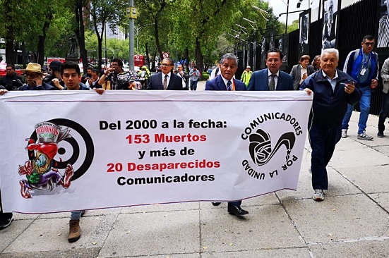 Un grupo de 15 periodistas se concentraron en el Ángel de la Independencia para marchar con dirección al Senado, para protestar por los 153 muertos y más de 20 comunicadores desaparecidos en el país.