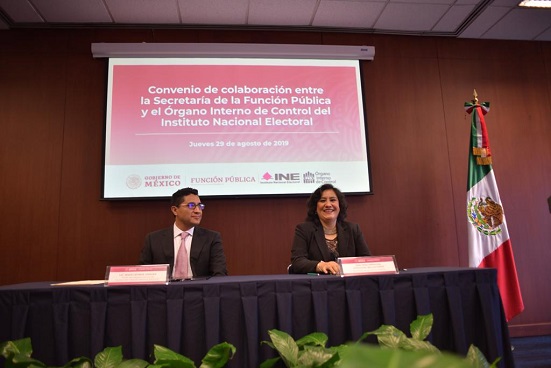 La secretaria de la Función Pública, Irma Eréndira Sandoval Ballesteros, firmó un convenio de colaboración con el titular del Órgano Interno de Control del Instituto Nacional Electoral (INE), Jesús George Zamora, para reforzar el combate a la corrupción.