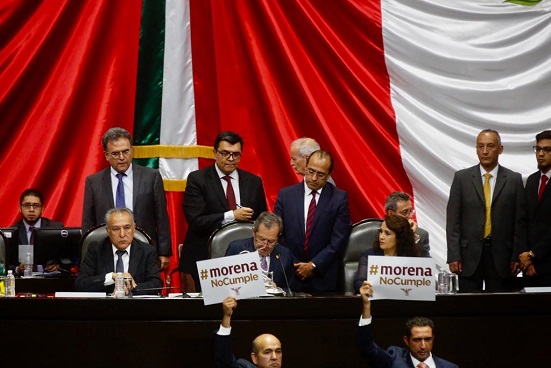 En tribuna, el coordinador de los diputados del Partido Acción Nacional (PAN), Juan Carlos Romero Hicks, rodeado de panistas con pancartas en las que se leía “Morena incumple”, expresó su rechazo al mayoriteo en contra y que “hoy no es un buen día para la democracia”.