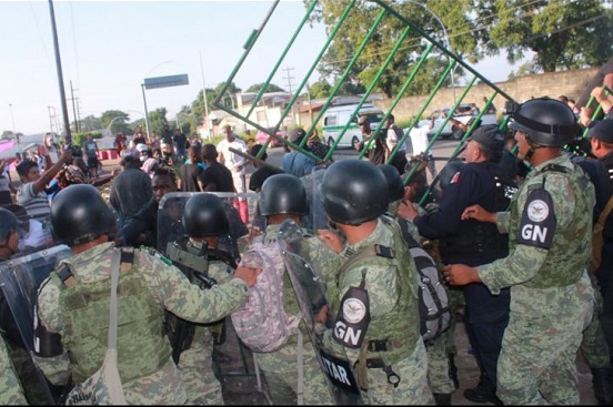 Los migrantes inconformes que llevan 17 días en protesta, tiraron vallas metálicas, y se resistieron a la contención de la Guardia Nacional y de elementos de la Policía Federal.