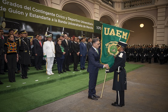 El rector de la Universidad Autónoma del Estado de México, Alfredo Barrera Baca, encabezó la ceremonia de abanderamiento y entrega de grados al Contingente Cívico Deportivo Universitario y el guion y estandarte universitarios a la Banda Universitaria de Marcha.
