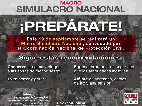 En el marco del segundo aniversario del sismo del 19 de septiembre de 2017 y el número 34 del ocurrido el mismo día, pero del año 1985, se realizará el Macro Simulacro Nacional convocado por la Coordinación Nacional de Protección Civil.