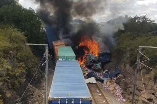 Pobladores de Nopala, en Hidalgo, se sobresaltaron cuando el estruendo de láminas retorcidas los alertó de un aparatoso choque entre dos trenes, que derivó en el incendio de una de ellas, por elderrame de su combustible, y cuatro lesionados.