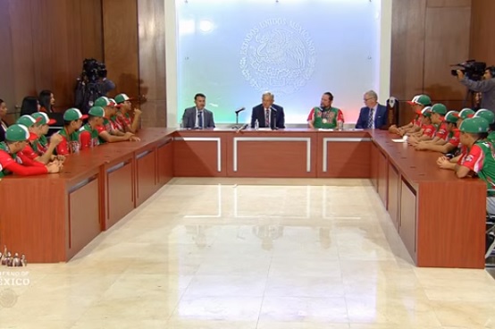 El presidente Andrés Manuel López Obrador recibió en Palacio Nacional a los integrantes de la Selección Nacional Infantil de Béisbol, campeona de la Serie Mundial Cal Ripken Jr. 2019, a quienes recomendó mucha disciplina y “nada de vicios”.