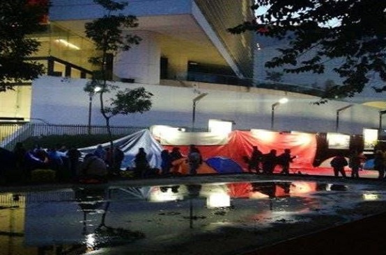 Por segundo día consecutivo, los integrantes de la Coordinadora Nacional de Trabajadores de la Educación (CNTE) mantienen casas de campaña en la lateral de Reforma, en la colonia Tabacalera, alcaldía Cuauhtémoc, en protesta por la aprobación de las leyes secundarias de la reforma educativa.