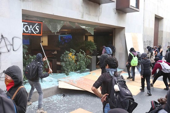 Los destrozos son acompañados por cohetones que prenden, además de que cargan extintores extraído de inmuebles, así como gasolina con amenaza de prenderla en los lugares que banalizan, sin que hasta el momento haya intervención policiaca.