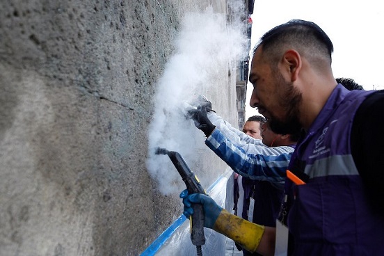 Luego del daño ocasionado por encapuchados al patrimonio histórico de Palacio Nacional, durante su participación en la marcha pacífica por los cinco años de la desaparición de los 43 estudiantes de la escuela normal de Ayotzinapa, se realizan trabajos de remoción de pintas.