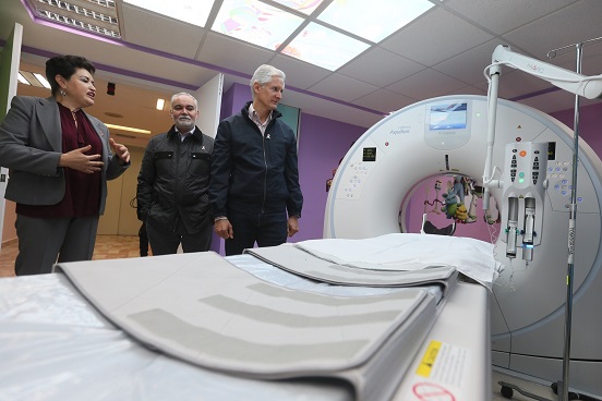 “Dentro de este esfuerzo que estamos haciendo para mejorar las instalaciones, el equipamiento para atender a las familias mexiquenses, hoy estamos haciendo entrega de un aparato muy especial que es este tomógrafo, que es un tomógrafo axial, que es muy moderno porque permite hacer una serie de cortes en las imágenes, de todo el cuerpo, para poder analizar cualquier afectación y esto permita, de manera oportuna, atender a los niños, a los pacientes”, destacó.