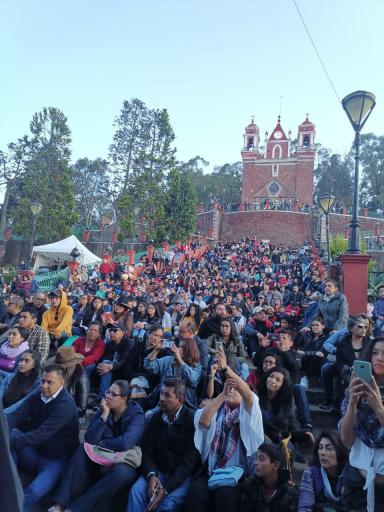El ambiente festivo que impuso la docena de artistas desde Cali, Colombia, fue por su entrega a Metepec con su característico ritmo, que motivó no sólo sensuales y candendentes movimientos desencadenados por los acordes y voces de los colombianos, sino también por la atenta invitación para que Edgar Moisés Martínez Chais, titular de la Dirección de Cultura se sumara a la agrupación tocando las congas.
