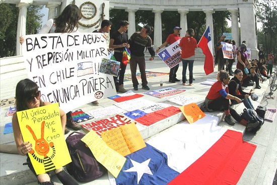 Un grupo de 50 jóvenes y residentes de Chile en México marcharon hacia el Zócalo capitalino haciendo sonar cacerolas y tambores, en protesta por la que denominaron represión militar contra sus compatriotas en ese país sudamericano.