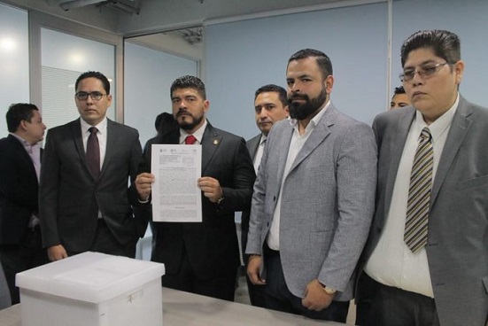 El titular de la dependencia, Zenyazen Escobar García, y el director del IEEV, Ricardo García Jiménez, así como el director jurídico de la SEV, José Miguel Hernández Durán, presentaron la denuncia ante el encargado de despacho de la Fiscalía Especializada en Combate a la Corrupción, José Alfredo Corona Lizárraga.