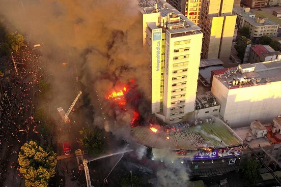 Un gran incendio afectó este lunes a un centro comercial que alberga a un hotel y varios locales comerciales y de consulta médica en pleno centro de Santiago, después de horas de disturbios, barricadas y violentas protestas.