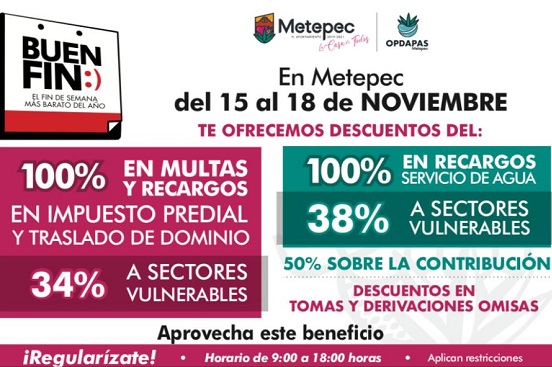 Los descuentos serán aplicados directamente en las agencias fiscales de la Tesorería y el Organismo en horario habitual de oficina el día viernes 15 de noviembre, mientras que el fin de semana se realizará únicamente en ventanillas del edificio central ubicado en la calle José María Morelos número 65, en el centro de Metepec.