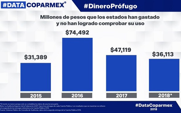 La mayoría de las entidades federativas del país aún siguen sin comprobar el uso de 36 mil millones de pesos, correspondientes al ejercicio fiscal 2018, advirtió la Confederación Patronal de la República Mexicana (Coparmex).