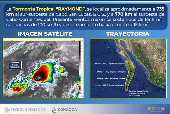 Estas condiciones mencionadas serán generadas por la masa de aire frío que impulsó al frente frío 13, y la tormenta tropical Raymond que se ubicará al sur de la Península de Baja California