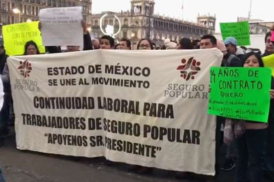 Trabajadores del Seguro Popular procedentes de varios estados del país se manifiestan afuera de Palacio Nacional, en el Centro Histórico, para exigir al gobierno federal que se revise su contrato laboral.
