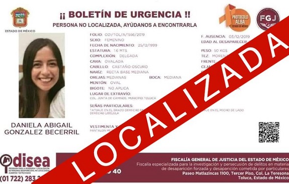 La estudiante de la Universidad Autónoma del Estado de México (UAEM), Daniela Abigail González Becerril, ya fue localizada sin que se conozcan más detalles hasta el momento.