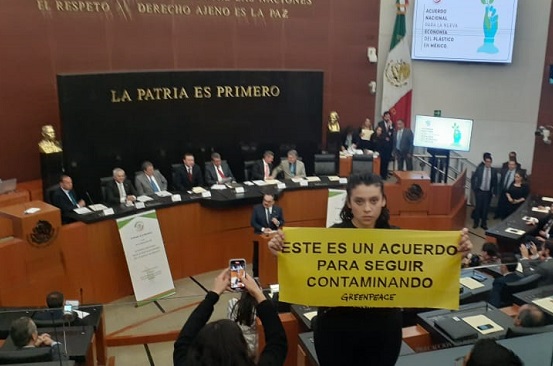 Un grupo de activistas de la organización ambientalista Greenpeace México se manifestó contra el “Acuerdo Nacional para la Nueva Economía del Plástico en México”, que se firmó hoy en el Senado de la República con la industria del ramo.