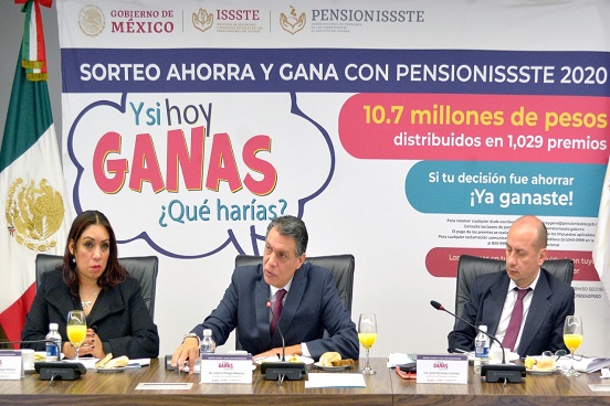 Puntualizó que el próximo sorteo “Ahorra y Gana con PENSIONISSSTE” se realizará el 20 de enero de 2020, habrá mil 29 premios que van desde mil hasta 350 mil pesos. Esta dinámica busca beneficiar a todos los trabajadores, sobre todo a los que reciben salarios más bajos, quienes tienen mayor posibilidad de obtener un monto más alto. Aclaró que estas cantidades se reflejarán en los saldos de su ahorro para el retiro.