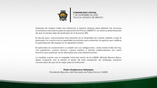 La historia de los Potros de la UAEM como equipo de la Liga de Ascenso terminó. Tres años después de haber logrado el campeonato en Segunda División y lograr su pase a la Liga de Plata, el Patronato del equipo anunció que debido a falta de solvencia económica dejarán de participar en el circuito, decisión que es respaldada por el rector de la Universidad Autónoma del Estado de México, Alfredo Barrera Baca, y que fue anunciada al Ascenso MX.