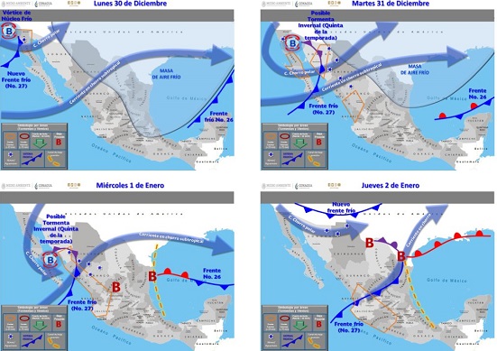 Un nuevo frente frío, el 27, se aproximará a partir de mañana en Baja California, el cual está asociado con un vórtice de núcleo frío y con la corriente en chorro, pudiendo generar la Quinta Tormenta Invernal de la temporada.