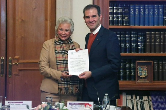 La secretaria de Gobernación, Olga Sánchez Cordero, presentó al consejero presidente del Instituto Nacional Electoral (INE), Lorenzo Córdova, el proyecto con que cuenta la dependencia -a través de la Dirección General de Registro Nacional de Población-, para avanzar en la cédula de identidad.