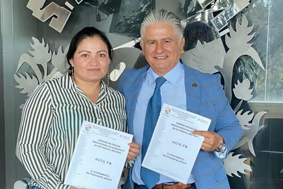 En la Casa del Servidor Público, el Secretario General del Sindicato Único de Trabajadores de los Poderes e Instituciones Descentralizadas del Estado de México (SUTEYM), Herminio Cahue Calderón, llevó a cabo la firma del convenio de sueldo y prestaciones con Lizbeth Nuñez García, Presidenta Municipal Constitucional de Otzoloapan.
