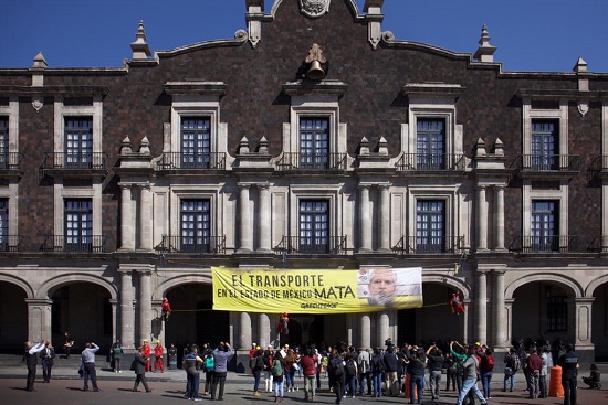 Los manifestantes colocaron una manta de 30 metros cuadrados en el balcón principal del con la leyenda “El Transporte en el Estado de México mata”, para exigir al gobernador Alfredo del Mazo Maza, un compromiso público con acciones, presupuestos y plazos precisos de un Plan de Movilidad que resuelva la problemática del transporte en la entidad.