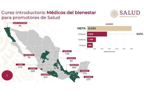La Secretaría de Salud ha impartido el curso de “Médicos del bienestar” a dos mil 646 personas que se convertirán en promotores de salud, lo que representa el 44 por ciento de su objetivo.