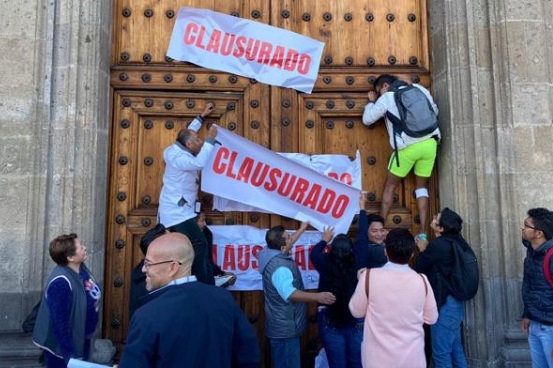 Padres de familia con niños que padecen cáncer “clausuraron” de manera simbólica la puerta principal de Palacio Nacional a manera de protesta por el desabasto de medicamentos en los institutos del sector salud. En el lugar también se encontraron pacientes, médicos y prestadores de servicio que denunciaron las deficiencias a las cuales se han enfrentado últimamente.