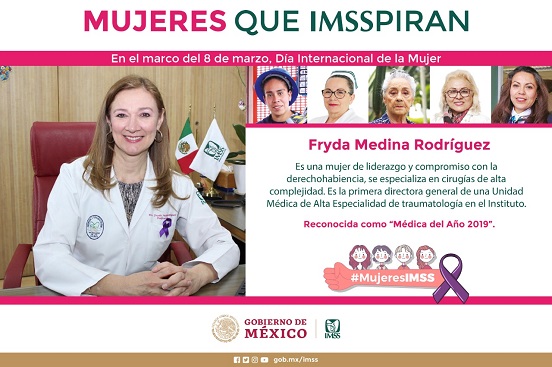El Instituto Mexicano del Seguro Social (IMSS) reconoció a la especialista Fryda Medina Rodríguez, propulsora del manejo inicial del paciente politraumatizado y promotora de una técnica quirúrgica de salvamento de extremidades.