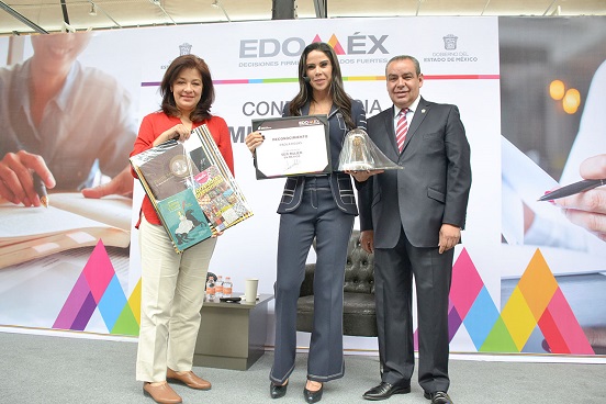 La Secretaria del Trabajo, Martha Hilda González Calderón, y el Subsecretario Izquierdo Rojas, entregaron un reconocimiento a Paola Rojas, a nombre del Gobernador Alfredo Del Mazo, por su participación en este foro que se llevó a cabo en el Centro Cultural Toluca.