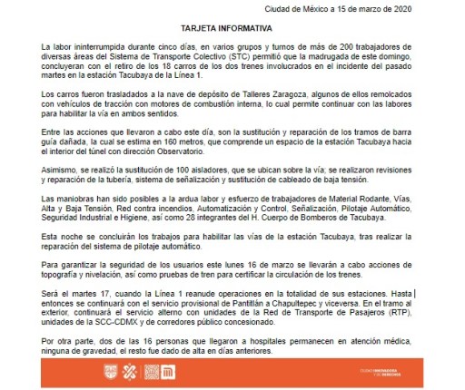 A través de un comunicado difundido en redes sociales, el Metro agregó que concluyó el retiro de 18 carros de los dos trenes que protagonizaron el choque en la estación Tacubaya de la Línea 1 y que ya fueron trasladados a talleres de la estación Zaragoza; además, se sustituyeron y repararon alrededor de 160 metros de tramos de barra guía dañada.